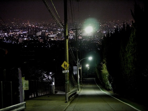 街頭に照らされる坂道の向こう側に広がる素晴らしい夜景に感動しつつ、
