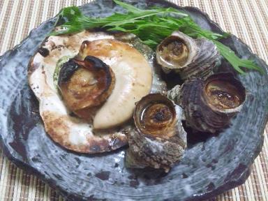 サザエと殻つき巨大帆立貝の焼きもの。