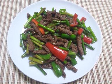 牛肉とにんにくの芽と赤緑ピーマンのオイスターソース炒め。